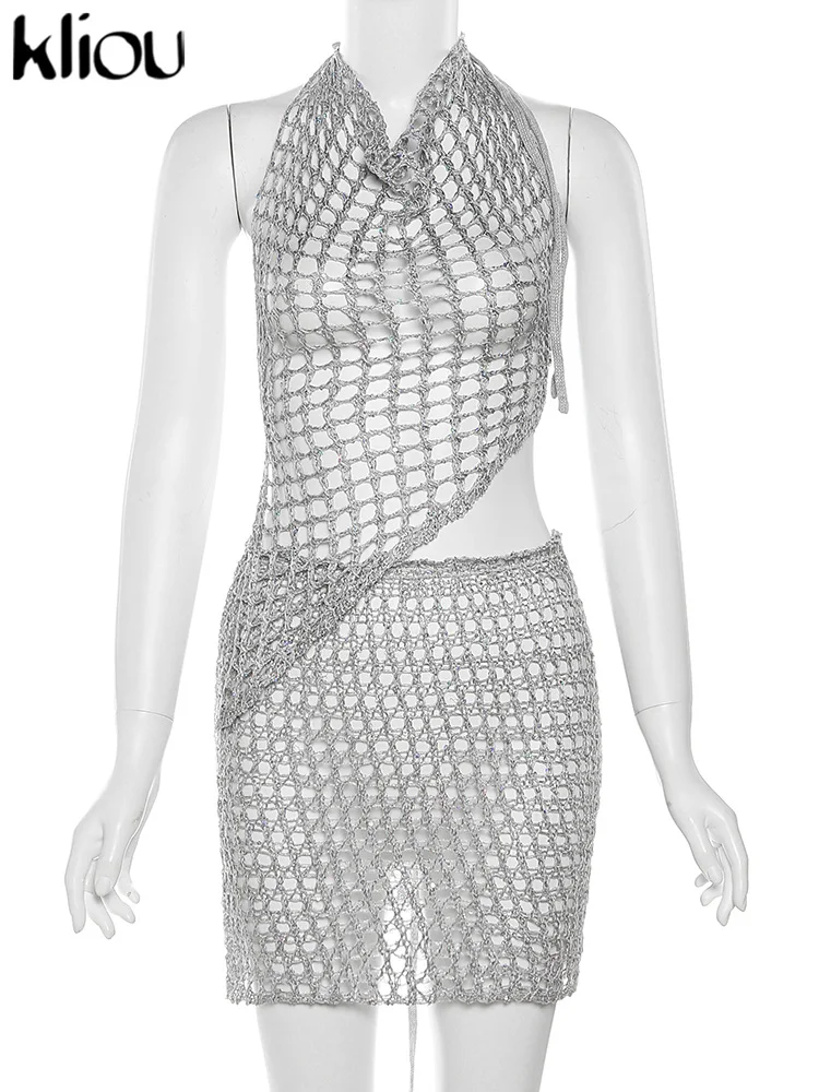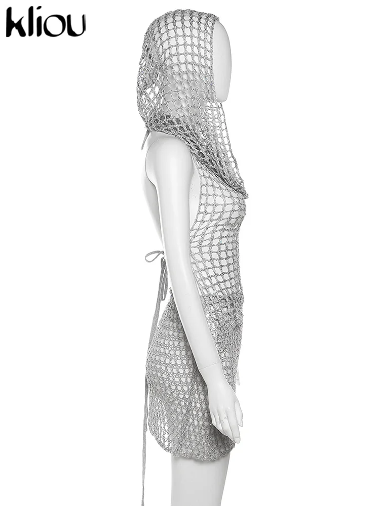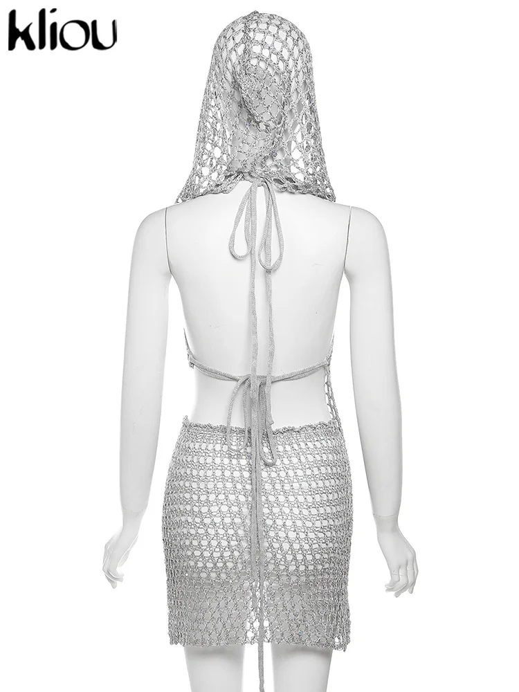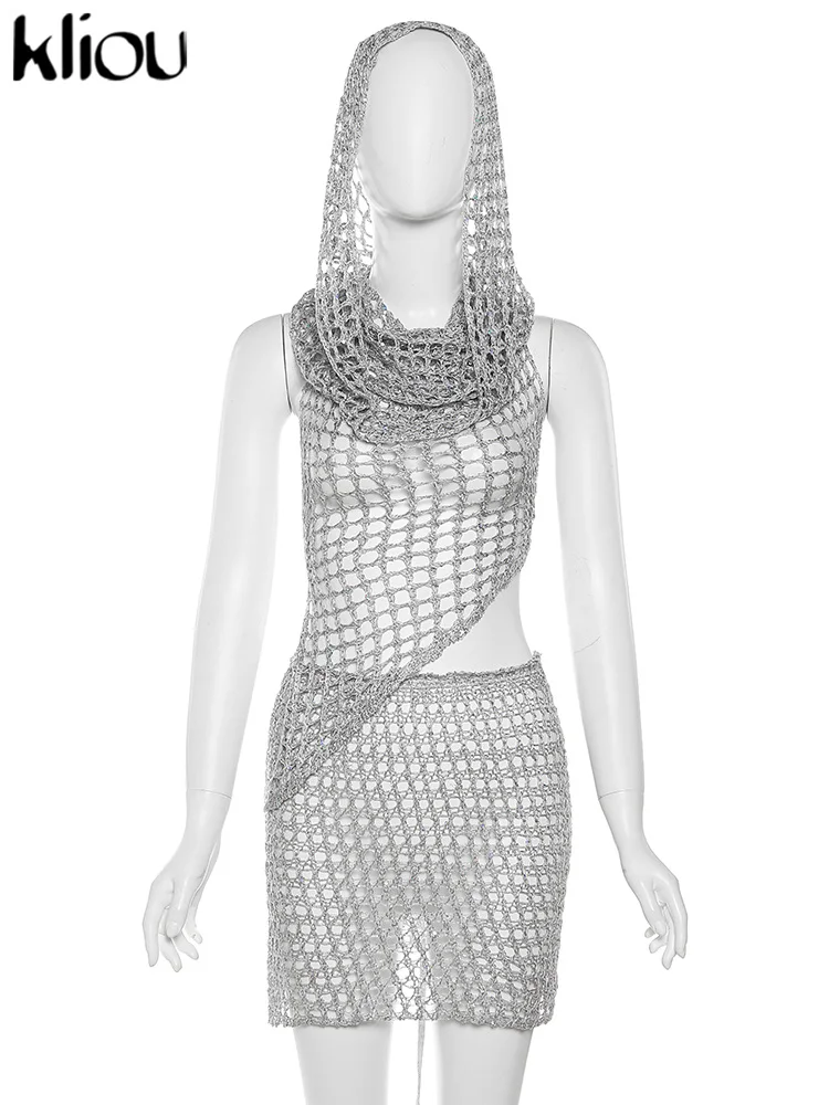Woven Hooded Solid Two Piece Set Bronzing Sleeveless Asymmetrical Bandage Backless Tops+Matching Hip Skirts